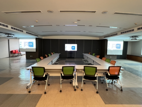 現場為可容納百人的教育訓練會議室 , 透過活動隔音牆的調整 , 可將空間分成前/後兩區同時使用 , 又或是兩區域打通做全區使用 , 故現場配置環控系統 , 可讓使用者快速的利用無線控制面板操作影音設備及燈光 , 切換所需的客製化使用情境。