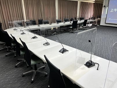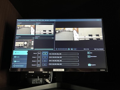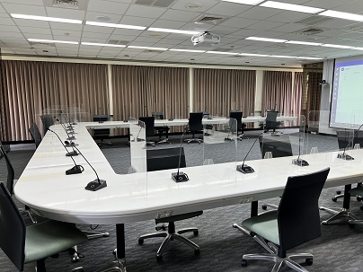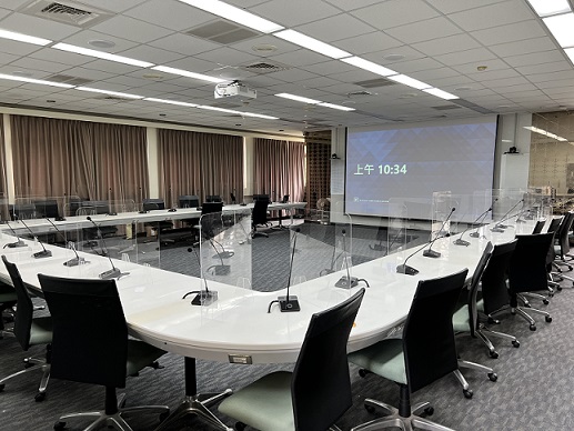 現場為可容納40人的視訊會議室 , 每個座位前方均有一組鵝頸式麥克風 , 並透過環控系統達到視訊鏡頭追蹤發言者的功能 , 再加上會議錄播系統 , 將各場重要的會議包含現場影像、麥克風對話內容及簡報畫面均紀錄保存下來 , 以供日後調閱使用 , 而環控系統則是方便管理人員開/關系統設備 , 及迅速的切換各種客製化模式 , 以利縮短會議前的準備時間。