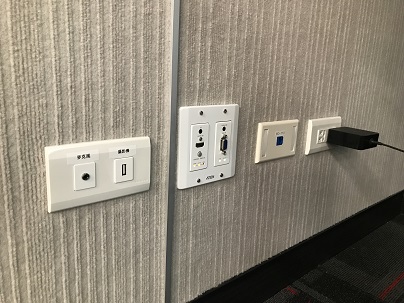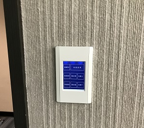 現場為可容納80人的視訊會議室(訓練教室) , 環控系統整合電源時序控制器、影音設備及燈光 , 一鍵即可完成會議模式 :